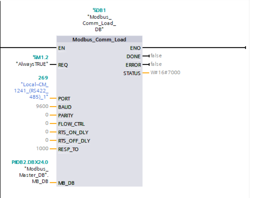 Modbus_Comm_load指令参数设置:REQ: 连接使能,连接成功后为真,可以直接连一个常量TRUE,我这里使用的是M1.2位存储,也就是"Always True"PORT:选择plc的com口,这里是"Local~CM_1241_(RS422_485)_1"BAUD:波特率,这里是9600PARITY:奇偶校验,这里选择0,表示无校验MB_DB:P#DB2.DBX24.0,这里是存储modbus通信数据的数据库地址,我这里使用的是db2,偏移量24,长度0,表示从db2的第24个字节开始存储modbus通信数据