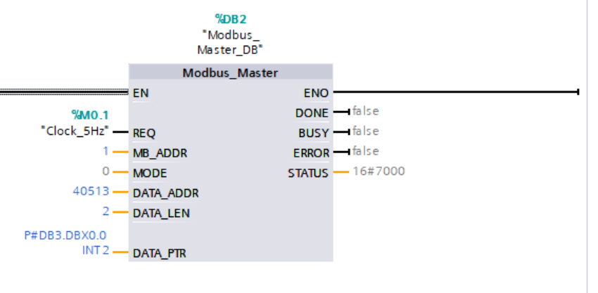 Modbus_Master指令参数设置:REQ:我这里使用的是M0.1,Clock_5hz,表示每200ms触发一次MB_addr:modbus从站地址,这里传感器的地址是1DATE_ADDR:介绍书上说温度地址是40513,湿度地址是40514。DATA_LEN:需要读取的寄存器数量,这里需要读取两个寄存器,温度和湿度,所以是2DATA_PTE:存储读取的数据的数据库地址,这里是P#DB3.DBX0.0 INT2。![]()